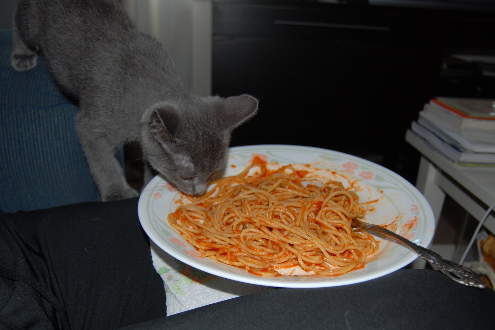After my walk I made a plate of spaghetti and sat down. She was climbing back and forth on the arms of the chair trying to sniff at my spaghetti, so I grabbed the camera and let her get in closer and sniff. She didn’t try to eat it, but about two seconds after this she did reach her little paw out and try to stand in it.