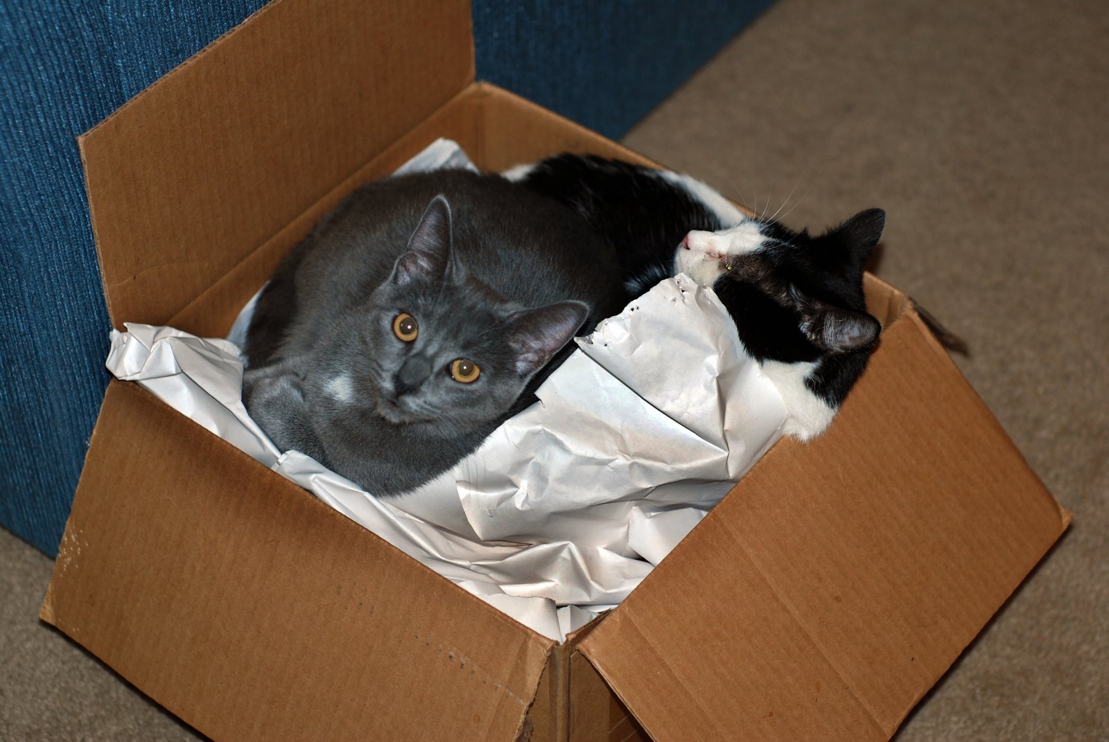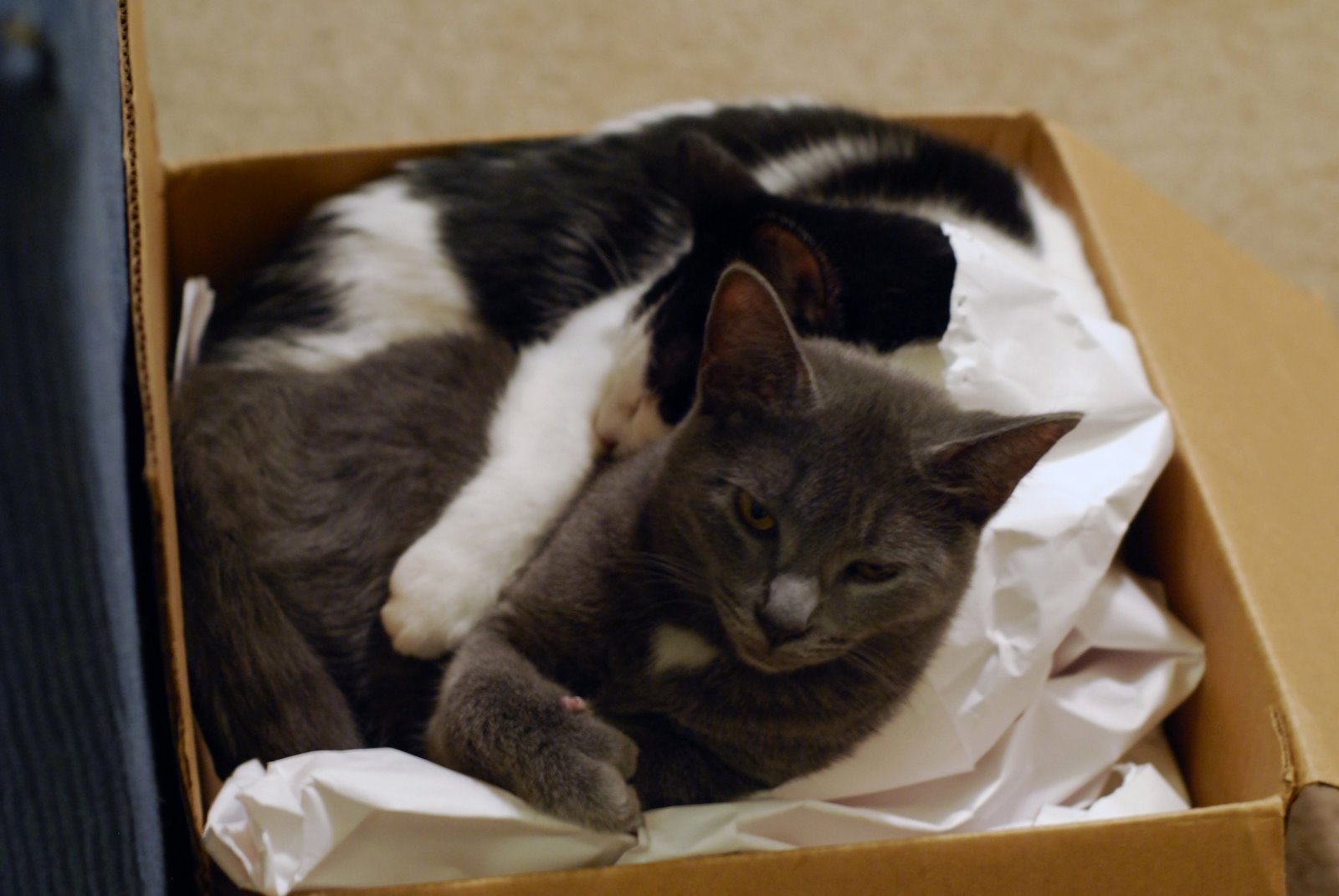 We know that while we’re no longer the newest, youngest, or smallest of your grand cats, we’re still your favorites. Right? We must be, or you wouldn’t send us the great presents you do! We would like you to know that we are very thankful for you, and especially for that box you sent us last month. Auntie Sarah has been very nice and let us keep it instead of recycling it, and I’ve made a little nest of the papers. Champ likes to chew on the flaps (she’s a little weird).