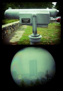 My 18 miles (which was really 19.22 – holy cow!) today took me through Blue Hills Reservation with an unintentional detour to Wood Rd and Barnes and Noble, for those of you familiar with the area. The unintentional detour meant that I made it to the Chicatawbut Overlook right at lunch time (PB & banana sandwich). Despite the haze, it was nice to have a good view while I rested and ate…and of COURSE the camera came out! Bigger is way better, so click the photo to enlarge.
