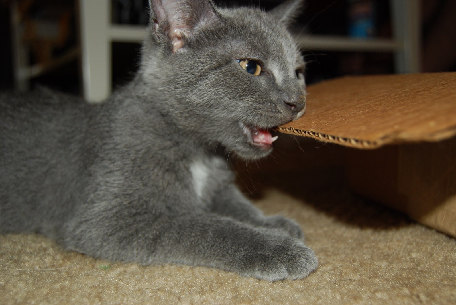 I really don’t understand – both of them love to chew on cardboard. You can actually see a series of punctures along the edges of the flaps on this box. Seriously, why buy toys? We’ve gotten more mileage out of this box (still the box the pedometer came in from Mom & Dad!) than we have out of the scratching post we bought.