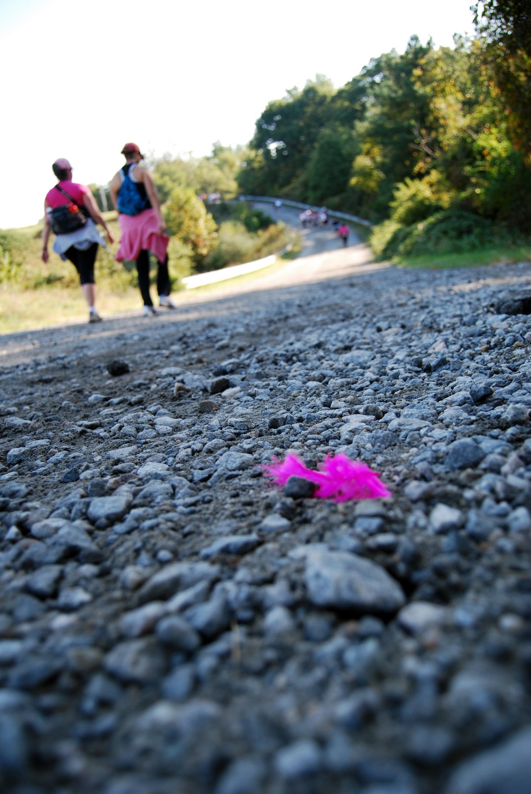 This photo above is the pink feather trail that you could follow for the entire route, all three days. There were enough feather boas or hats with feathers or whatever that they were shedding all weekend long, and you’d come across a single feather periodically. If you couldn’t see walkers ahead of you wearing mostly pink to know you were on the right path, you could almost always find a feather! That’s Emily and Alyssa that you can see walking…and some really boring road in Northern VA with no sidewalk.